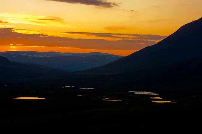 Solnedgång över Gasskatjåhkkå. Från tältplatsen nedanför Niják