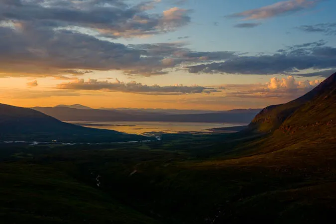 Utsikt från Sjnjuvtjudis. Till vänster sticker Gasskatjåhkkå fram. Vuojatädno rinner ut i Akka jaure. Till vänster Áhkká.