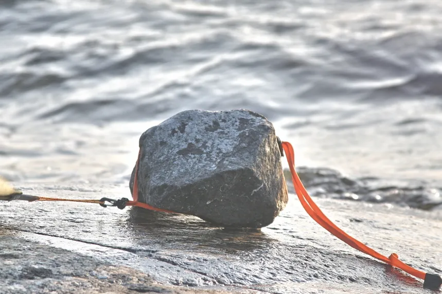 "Tältsten" och en snodd från kamerafodralet höll fast absiden i vinden.