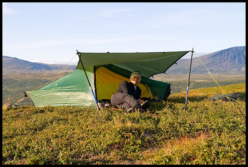 Min 200g enmanstarp. Gjorde årets vandring mycket behagligare vid lunchraster och fikastopp i regn och blåst. Väldigt praktiskt extratak till tältöppningen vid lätt regn. Eftersom den bara väger 200 gram var det ingen större börda att ta med