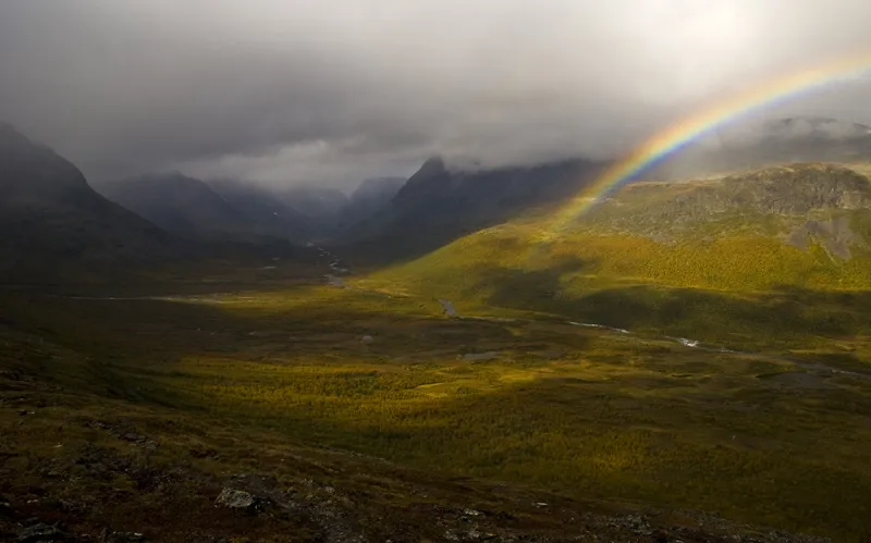 Fin bild, kontrasterna med sol och regntunga mörka moln samt regnbågen som gör det lilla extra. Härligt.....