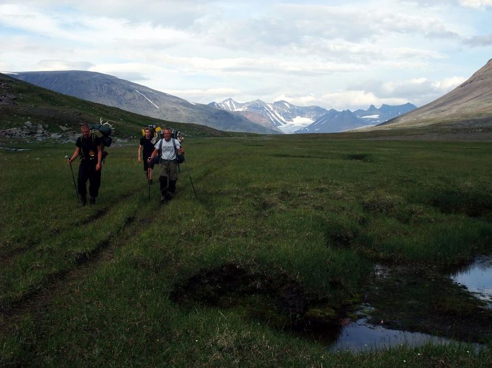Vilken gräsmatta! Alkavagges övre del är fantastiskt lättgången. Sarekmassivet i fonden.