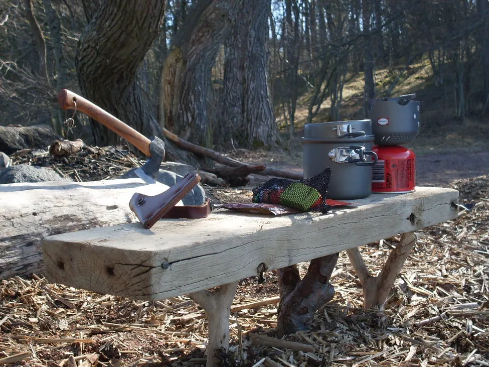 Litet nytt kök som skiner. Eller är det bara gasburken som löser i sin röda dräkt. Du har fångat en skön stund (tror jag). Mat ska tillagas (påsen ser oöppnad ut) i en skönt väder. Undrar vad yxan gör där … fixas det ved?