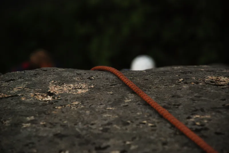 Repet ner över klippan, Alfreds huvud syns i bakgrunden.