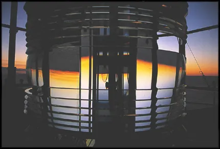 En maffig solnedgång genom det välputsade prismat tillhörandes fyren på Svenska högarna.