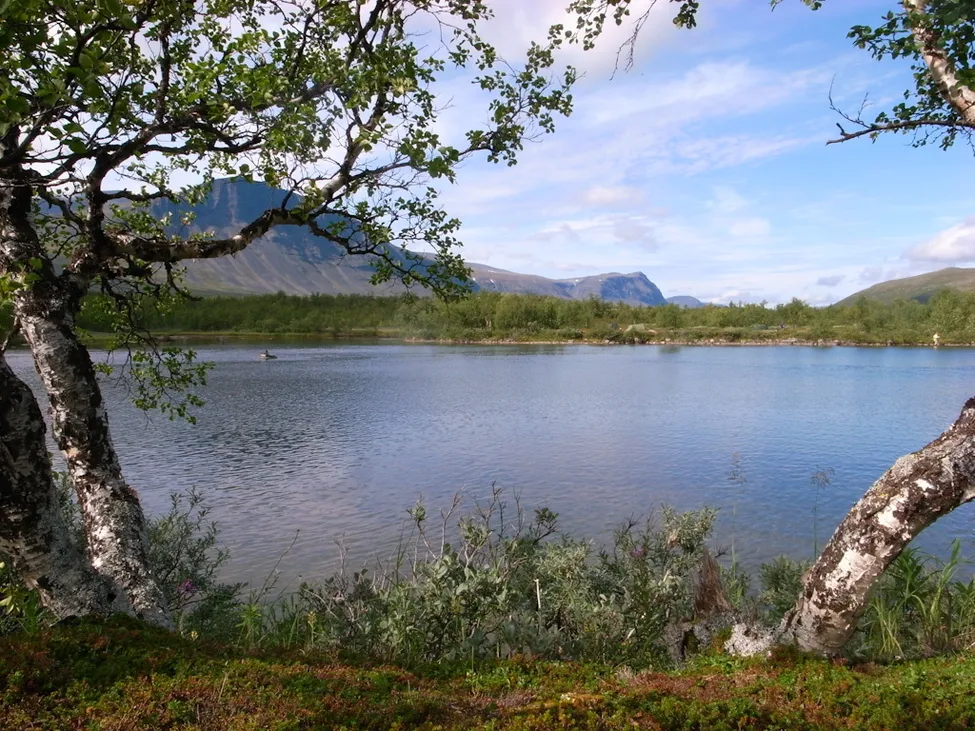 Vi slår läger vid ett bredare sel nedanför en forssträcka, med utsikt över Rivgoaivi (1436m). Bilden tagen från andra sidan selet.
