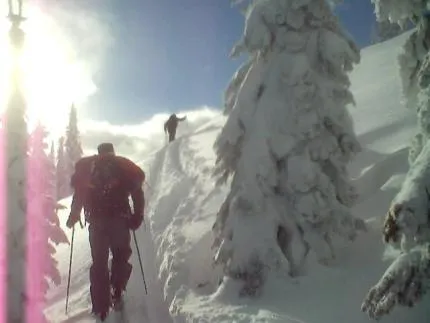 Här har vi Eric, o Sarah på väg upp mot toppen o Eric avaktar tills Sarah nått säkrare terräng innan han ger sig ut i det öppna o exposerar sig mot lavin fara. Allt del i MAST programet.