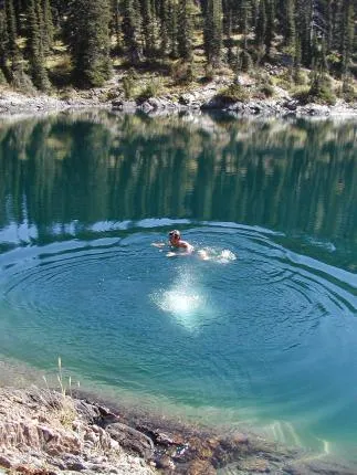 Härligt dopp i iskallt glaciär vatten, kallt men uppfriskande efter en lång dags vandring i härligt väder i klippiga bergen.