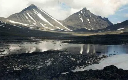 Nipals och Pyramiden speglar sig i vattnet.