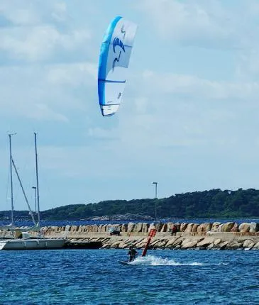 Vill med denna bild visa vad kitesurfing är för något: En bladning mellan skärmflygning, wakeboarding och vindsurfing. Med en vinge(drake) på ibland över 20 kvm stor kan man göra hopp på över 15m höga och 100m långa. Draken kan generera tryck uppemot 300kg. En ny extremsport från Hawaii(Frankrike) som expanderar mycket snabbt i Sverige.