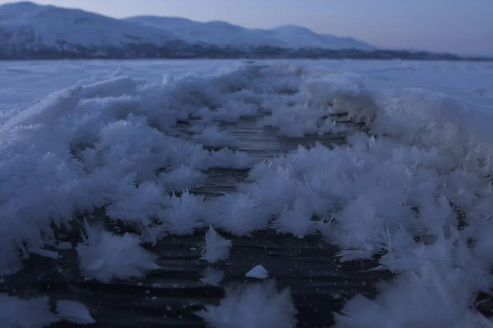 På vägen över Torneträsk ser vi dessa fina rosor skapade av naturen, de har vuxit till sig på nyis i en nybildad råk på isen.