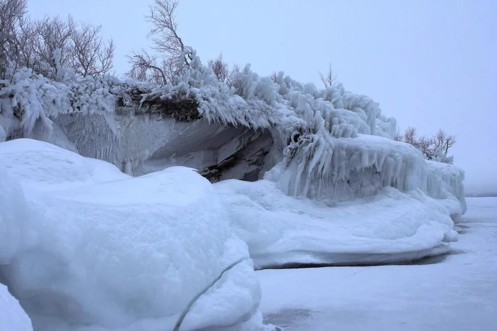 Efter att vinden har blåst i December samtidigt som det har varit -15C i luften skapades dessa vackra och fantasifulla skulpturer på stranden av Torneträsk.