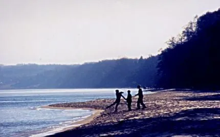 3 barn kastar stenar i sjoen ved Stenshuvud i Skaane.