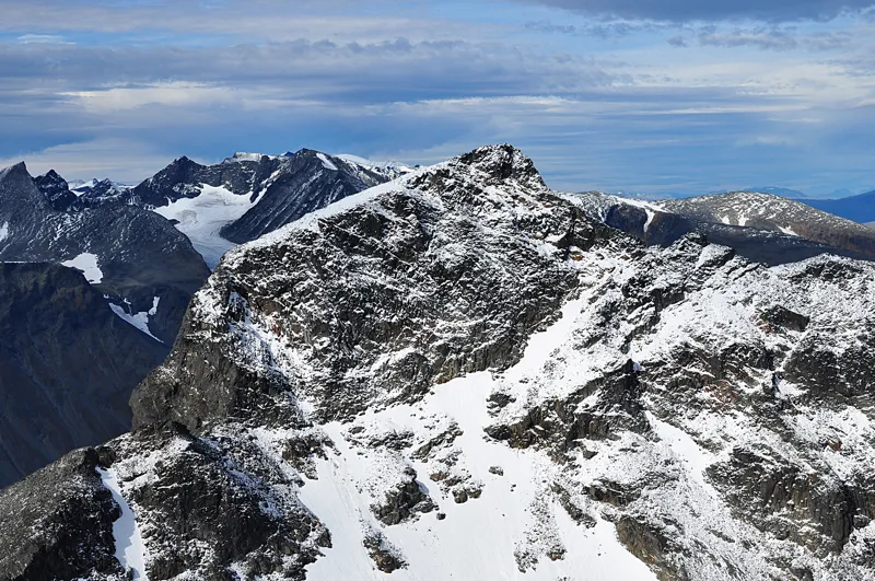 Det mäktiga Pierikpakte 1789 möh fotograferat från Nilas kam. Bakom till vänster skymtar Sarektjåkkåmassivet.