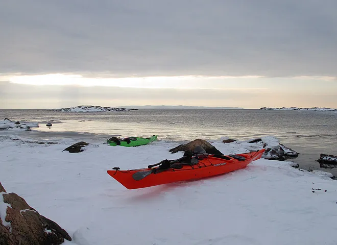 Snygg bild! En skön kontrast mellan de olika årstiderna, den vita snön och den röda kajaken!