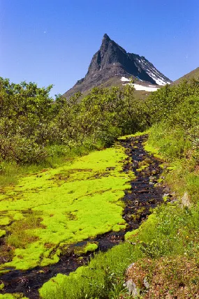 Vi kom gående från Vistas mot Nallo. Det hade regnat flera dagar, men idag var det underbart väder. Helt plötsligt så kom vi fram till den här bäcken med en nästan overklig grön mossa...