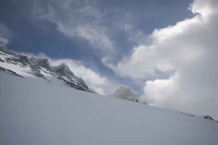En fin fjällbild, dramatisk himmel och med en människa som en liten prick.