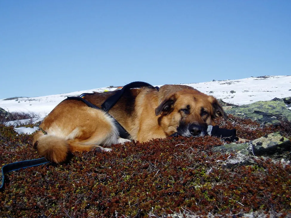 NÖJD HUND EFTER EN LÅNG TUR BEHÖVS VILA