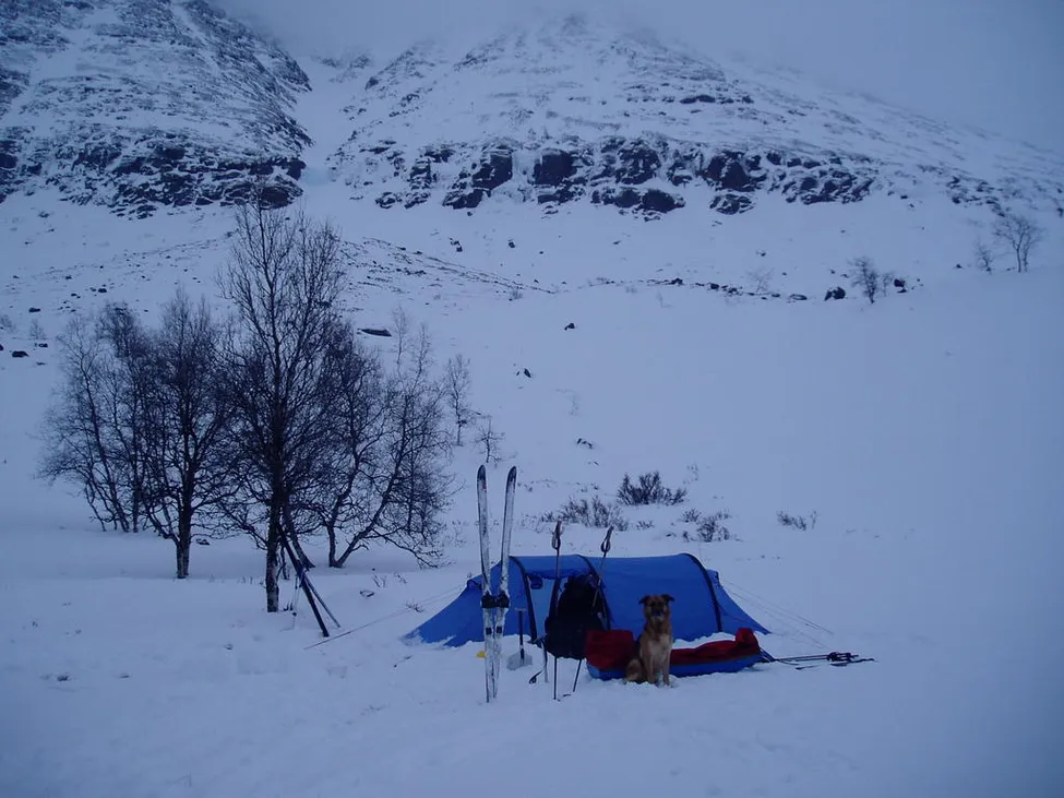 Ah, vad kul, tältet och vovven känner jag igen! Vi träffades på i Ruotesvagge 7/4. Ser ut som ni fick en fin tur trots bruten skida!