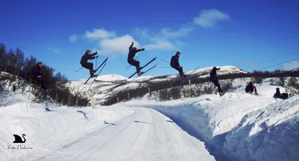 Johannes Måseide hoppar över en väg i Finnmark, Norge. Gjordes på telemarkskidor med 300 m sats.