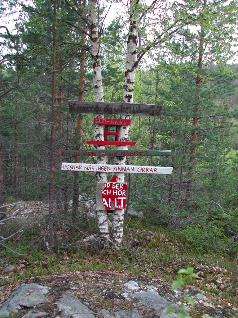 Hittade denna mycket hjälpsamma skylt när jag gick efter en stig i skogen, tyvärr var luren borta så jag kunde inte ringa gud direkt...