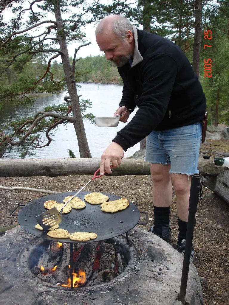 Här står min bror Micke och lagar frukostbröd på Murrikkan...