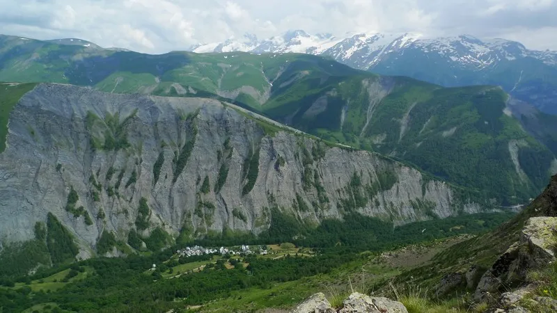 Efter refuge du Col de Sarenne. Leden går i sicksack ner mot dalen. Den gröna plättan ovanför är Plateau d'Emparis.