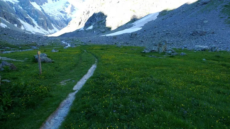 Vacker grönslätt, Source de la Romanche. Det häftiga är att något km innan ser man inte mycket av gräs eller grönt slätt. Man får en känsla att man är på väg in i en karg bergmiljö men helt plötsligt når man en stor grön slätt med blommor, gräs och andra växter!