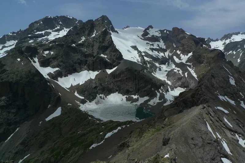 Vi hade gått upp till Col de Grangettes 2684m och försökte sedan hitta en stig som ska leda till sjön Lac de l'Eychauda men fann det svårt och dessutom osäkert. Enligt en belgisk vandrare finns en led men svårt att hitta uppifrån, lättare från sjön. Så det blev aldrig någon nerstiging till sjön där vi tänkte tälta. En annan gång istället. Sjön ser vackert ut på avstånd.