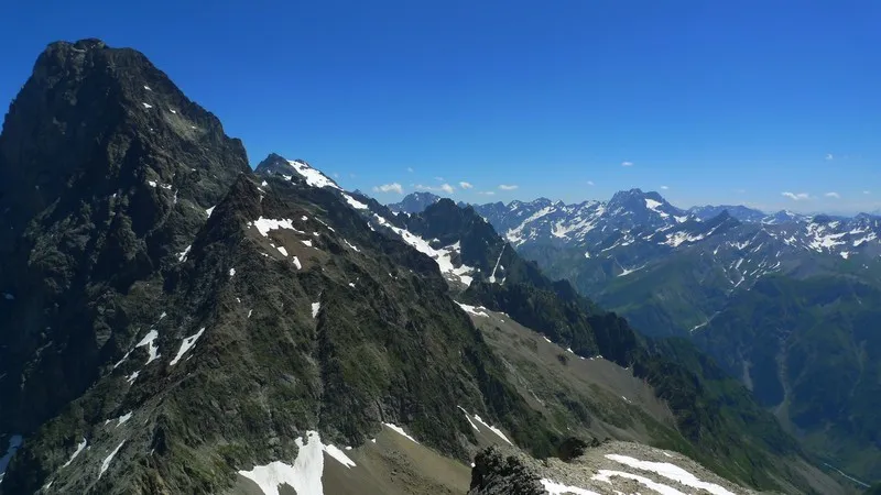 Här står vi på toppen, Pic Turbat 3028 m. Bergtoppen till vänster som ni ser är L'Olan 3564m. Vi såg långt härifrån, bla Le Sirac 3441m som ligger till höger, långt i bakgrunden. Även syns Pic de Vallonpierre 2738m