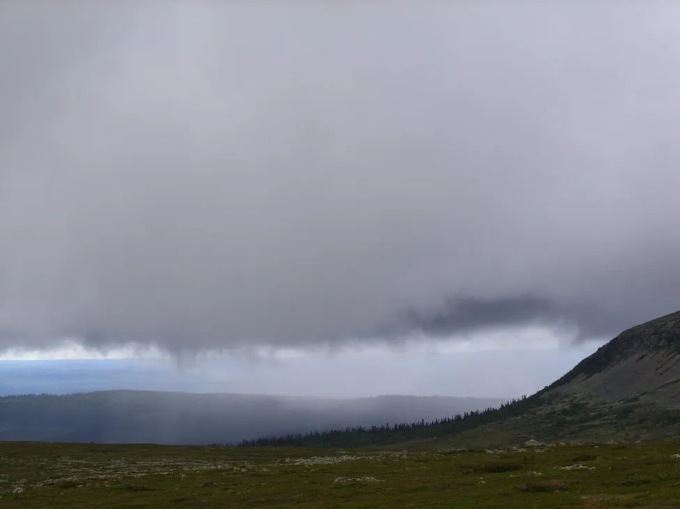 Tunga regnmoln på väg in över Nipfjället