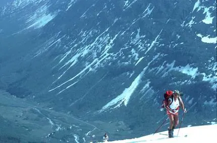 Anna på väg upp för Flötatind i Romsdalsalperna, en solig majdag. I dalen har björkarna slagit ut, på toppen väntar knädjup pudersnö.