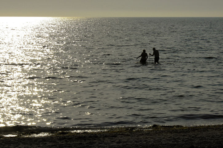 De är på väg att bada, äldre har svårt att gå ibland, gäller även i vatten på ojämn botten, gåstavar är ett bra hjälpmedel att röra på sig, även på äldre dagar! Starkt tycker jag!