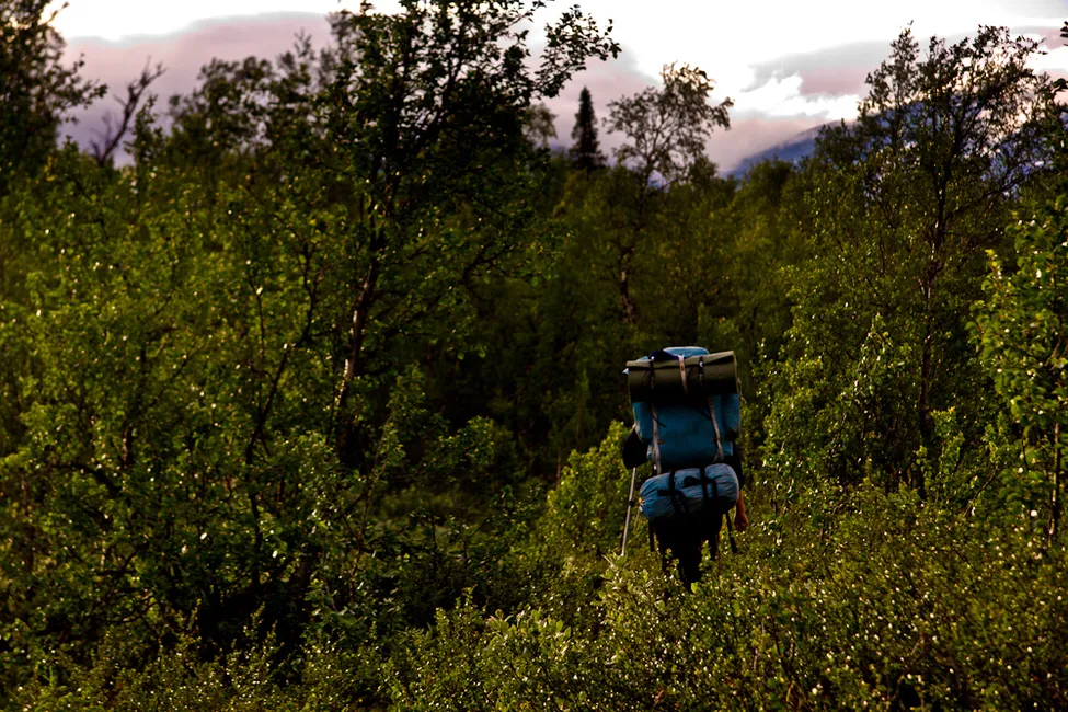 Kerstin banar sig väg genom fjällbjörkskogen vid Dáhtajiegge