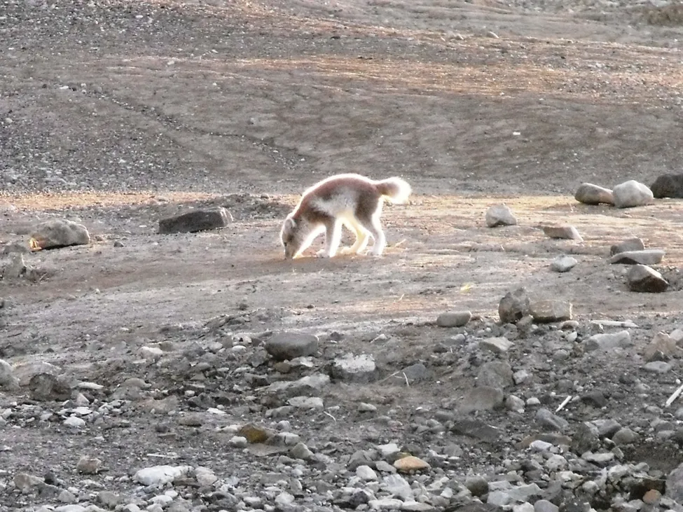 Grattis till att ha fått se vild fjällräv! Det är väl ingen idé att fråga var... Ser ut som han har blivit av med en bit av svansen.