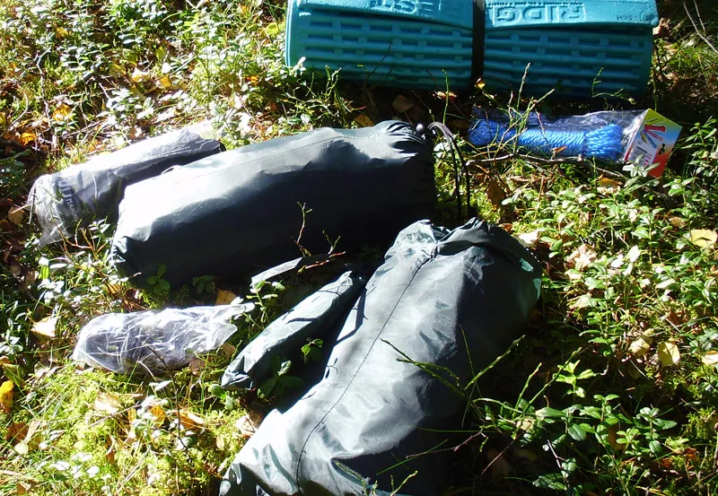 Delarna i kombi-settet från huskygard.se: Hängmatta + elastiska linor, tarp + 4 tältlinor med tältpinnar. Samt liggunderlag och en tvättlina.