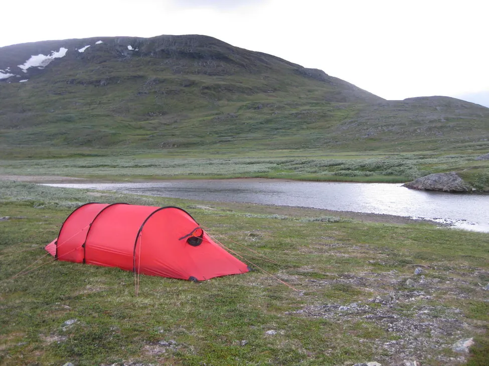 Vi slog upp tältet på torr hedmark strax intill Viejejåkkå, nordnordost Jållevare. Det var blåsigt, mulet och vackert.