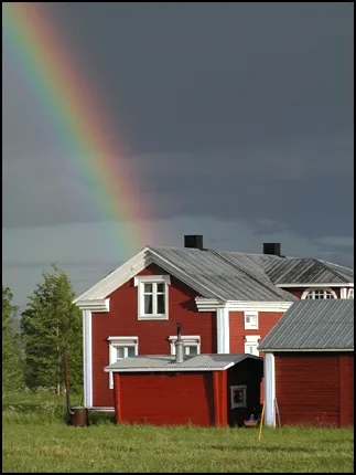 Efter en härlig regnskur på kvällskvisten bildades den här regnbågen som "slår ner" precis där skatten ligger. I huset bor killen man ska snacka med för att få tälta vid Matkakoskivågen
