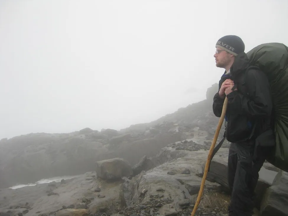 I och med att vi lämnade Jållejaure för vidare färd söderut - upp mot Jeknaffojiekna - klev rakt in i molnen. Sikten var i det närmaste noll. Vi gick på kompass och siktade strax väster om punkt 1314. Redan innan vi nåde dit hade marken förvandlats från lättgången gräsäng till hal och svårgången stenskravel.
