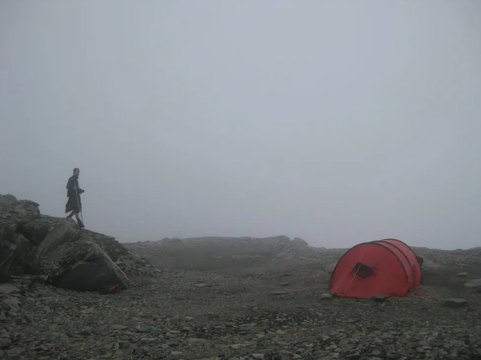 Vår utflykt mot toppen hade tagit hela förmiddagen. Det var inte lätt att hitta tillbaka till tältet trots att vi ansträngde oss att gå på så många snöfält som möjligt. Det disiga ljuset gjorde att det räckte med att gå någon meter vid sidan av fotspåren, så såg man dem inte. Till slut kom vi ändå tillbaka. Vi beslöt att riva tältet omedelbart för att se om vi istället kunde komma UNDER molnen, när det nu inte gick att komma ÖVER dem.