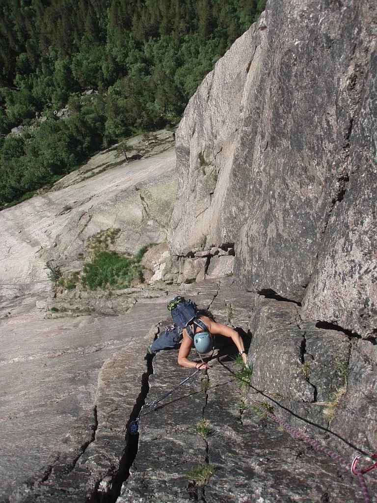 Sylvia på tredje replängden på Mot Sola. Kruxet är någon replängd högre upp men är av boulder karaktär från en fin hylla. Man känner sig inte särskild utsatt.