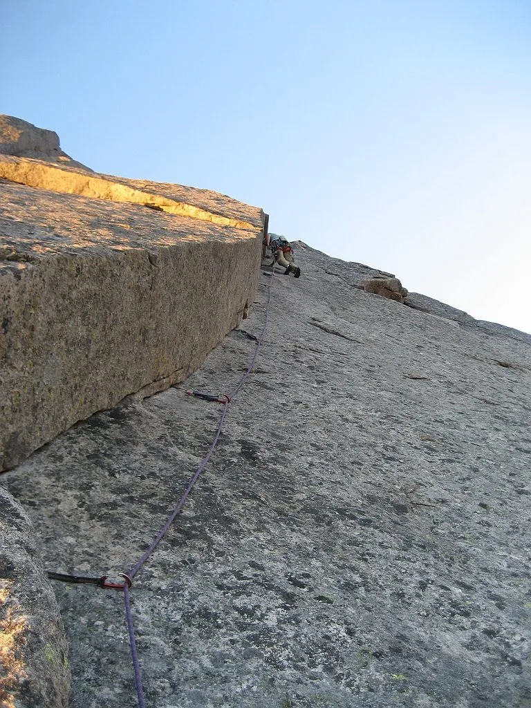 Den ökända "slanting corner" nerifrån. Inte särksild svår, men ganska bökig. Jag skulle inte vilja klättra denna repa med en ond rygg.