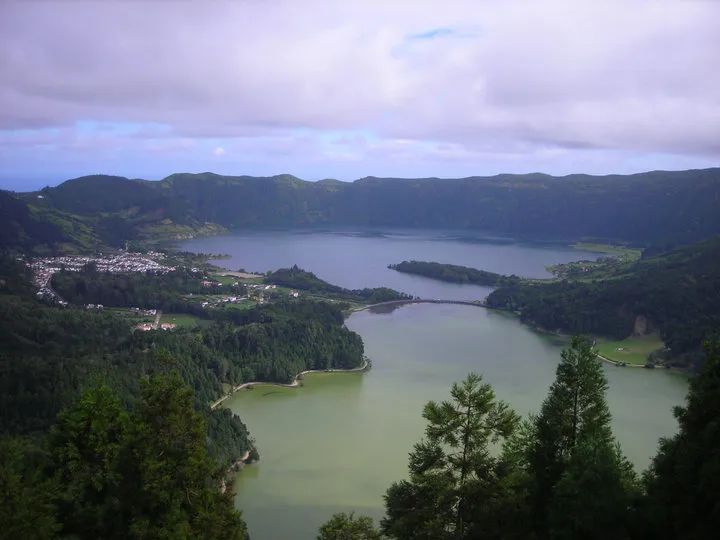 Såg t.om. trevligare ut i verkligheten. Min kamera återger färgerna kalaskasst. Den närmre sjön ska se närmast grön ut (lagoa verde) medan den bortre är rätt blå i fägen, beroende på väderlek.