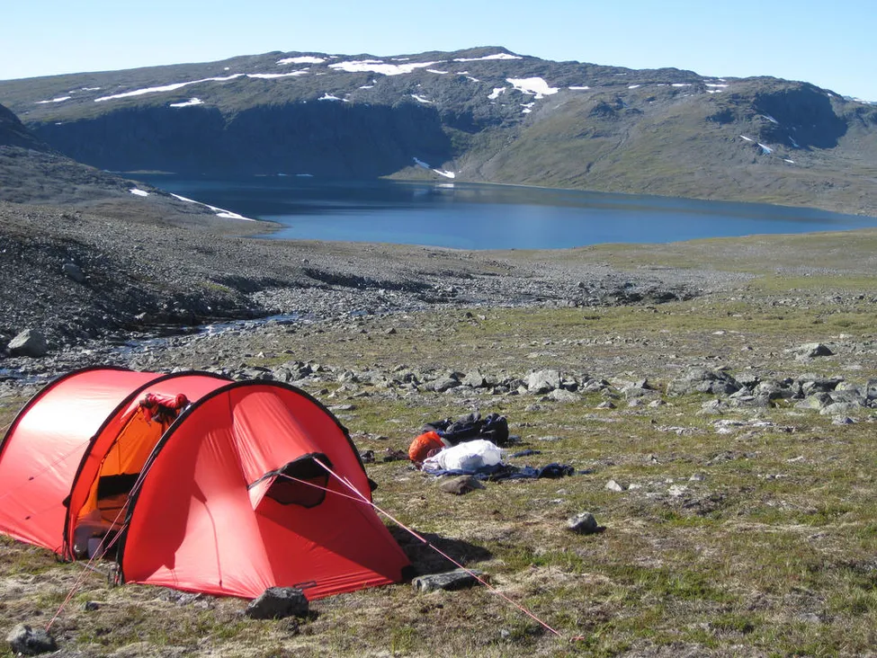 Vi följde nu jokken från sydost och började klättra så sakteliga uppåt. Vår tanke var att vandra så att vi kunde ta oss upp på Kaisekietj-tjåkkåhs båda högsta toppar rakt österifrån. Marken blev snabbt ganska stenig och det var inte så lätt att hitta bra tältplats. Mer om det på nästa bild.