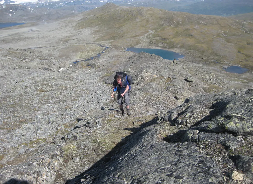 När vi kommit lite högre upp och tittade neråt, så såg vi att vi inte hade valt den bästa vägen. Det hade varit betydligt mer intressant att från punkt 1028 sikta mot punkt 1249 och sedan fortsatt vandra på kanten ner mot Kailavagge. Där fanns ett flertal småsjöar SO om höjd 1249 som inte är utritade på kartan. (Se bilden.) På detta avstånd såg det också ut som om där skulle gå att hitta skapliga tältplatser.