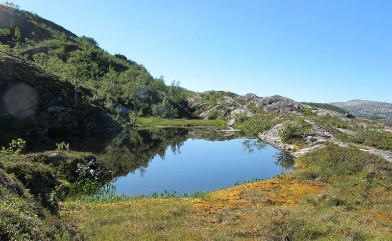 En dryg halvkilometer väster om sjön och bron börjar vi söka oss uppför sluttningen mot Svenskhammaren vid Linnéruta, som den kallas på norska kartor.