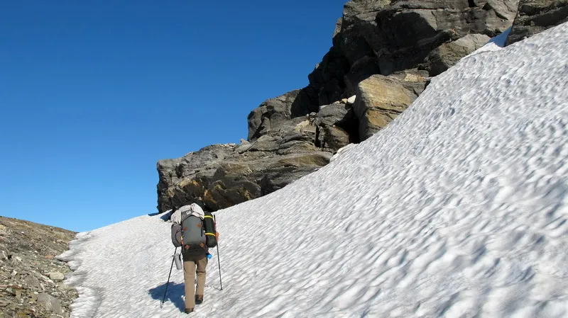 Boadnjasjtjåhkkå. Snöfältet förde oss en bekväm halvkilometer framåt. Det var förmodligen mera sådant på Linne's tid.