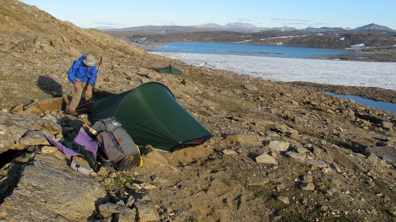 I sänkan norr om glaciären tältar vi. En mossklädd plats och en sandbädd.