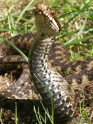 På en, för mig vanlig, foto- svamprekognoserings-runda råkade jag störa denna solbadande huggorm. Den poserade en stund för mig och gav sig sen av efter ett skenutfall, väsande.