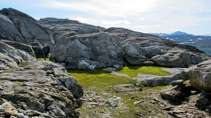 Bakom det stora klippblocket öppnar sig en plan mossklädd slingrande gångväg fram till bäckravinen